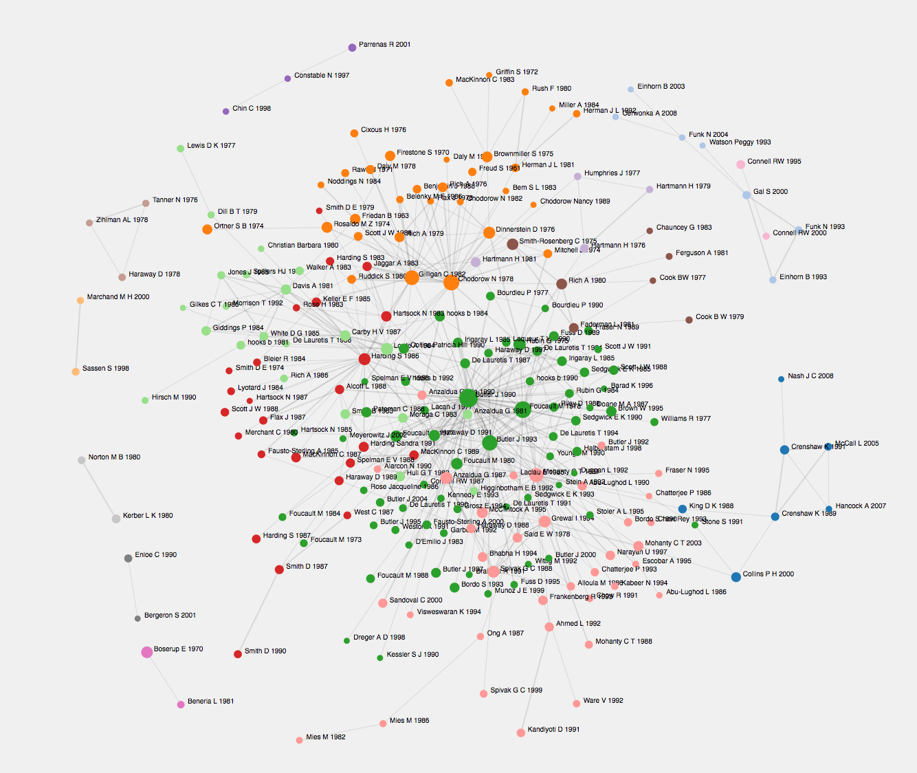 Rather than mapping articles published in Signs, the graph provides a way of viewing the broader field of feminist scholarship that is reflected in the sources cited in the articles that the journal publishes. The assumption operative in this type of graph is that scholarship can be viewed as conversations among various participants represented by particular sources; sources that tend to be cited together are being put into conversation with one another and are thus representative of a particular strain or school of thought within a field.