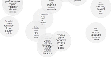 Signs' 40th anniversary website represents an extraordinary space for fluidity, motion, and play. In the interactive Cocitation Network Graph, feminist scholars' names-in vivid color-appear to skate and skitter across a frictionless surface. Pull one name across the screen, and a network of names swims with it. In the background the larger network orbits and spirals, the connections made over decades of meticulous scholarship seeming, here, to serve as a gravitational pull within a feminist scholarly outer space. Click on Years within the Topic Model Browser, and the themes and foci appear as a crazy quilt, a sea of color representing the shifts and continuities over four decades of scholarship in Signs. Toggle from Topic Grid to Topic Space, and neat rows of topic bubbles swim across the screen to overlap, revealing the myriad connections and interconnections forged over the journal's history. The site is interactive and responsive, and in its open-endedness, it invites feminist scholars—in an era of academic job searches and tenure review; teaching, research, and administrative demands—to do something dangerous and subversive: to lose time. And by making visible connections that might never be revealed through a linear reading of the journal's content, the site begins to deliver on a foundational aim of feminist scholarship: to unsettle old assumptions and reveal hidden linkages; to question the taken-for-granted and reveal the unacknowledged. To do what the journal's founding editors set out to do in their very first editorial: "to amass fresh data, and to generate new concepts, tools, and techniques ... to question the social, political, economic, cultural, and psychological arrangements that have governed relations between females and males, that have defined femininity and masculinity" (Stimpson et al. 1975, v).