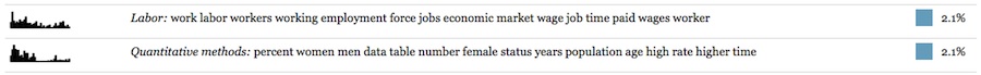 So too does the fortieth anniversary website, as I hope I have shown. I have used only a portion of the metrics and visuals offered by the site, but I can still testify that topic modeling made exploring the Signs archive easier and much quicker than it would have been otherwise. Still, there are issues. Some of the topics seem arbitrary, and the articles assembled by a "family of words" seem themselves unrelated, as in this topic. I'm sure that the topic modeling will undergo further refinement in the future, but in the meantime, readers of Signs have at their disposal a powerful new instrument for detecting change in the journal and therefore in academic feminism.