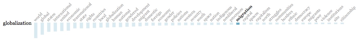 While authors listed under this topic might not have cited each other's work, the topic model provides professors with a preliminary analytic framework in which to help students imagine scholarly conversations that the authors themselves might not have even imagined when considering a body of literature on gender, migration, and labor. For example, Adele Jones's "A Silent But Mighty River: The Costs of Women's Economic Migration" (2001) does not directly address the specific issues that the Filipina care workers in Rodriguez's article encountered, yet Jones's analysis of interregional and international women's labor migrations provides an overarching framework in which to examine Filipina women's migrations and the labor migrations of other women who migrate from poorer to wealthier countries in search of domestic service employment. In addition, professors could teach students how bodies of literature are made through explicit scholarly dialogues. Professors could conveniently point to Jones's references to Chandra Talpade Mohanty's work in her article and ask students to read Mohanty's "'Under Western Eyes' Revisited: Feminist Solidarity through Anticapitalist Struggles" (2003), which also appears on the list of articles under the Globalization topic, to gain a deeper understanding of how Jones drew from Mohanty's scholarship to construct her own argument.