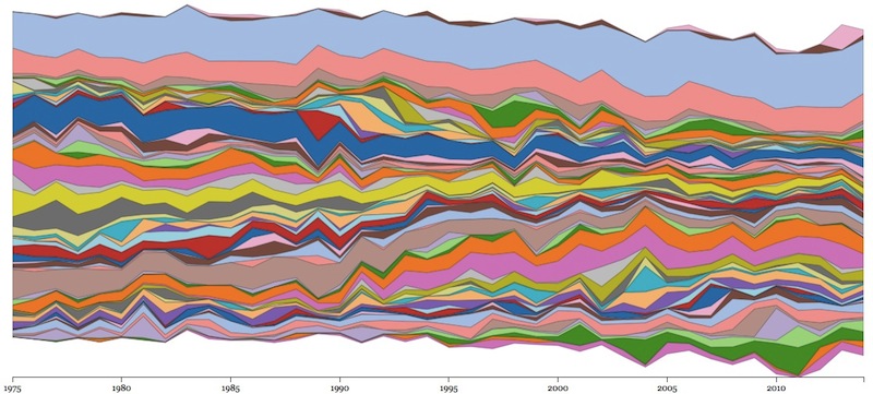 "Crowds roar. Ticker tape falls. [SIGNS] becomes official" (Stimpson 1974). In the forty years since Catharine Stimpson, founding editor of Signs, wrote these enthusiastic words to Jean Sacks, manager of the Journals Division at the University of Chicago Press, Signs and the world have undergone dramatic changes with the rise of digital technology. The angular waves of the stream-graph capture variations of feminist intellectual labor and knowledge production through time and space. The exquisite image also embodies advances in computer-mediated techniques that render images reflecting complex relationships of words and families of words. These new generations of digital tools open new possibilities, altering traditional methodologies with potential for new pedagogies while increasing accessibility to scholarship for broader audiences.