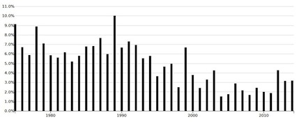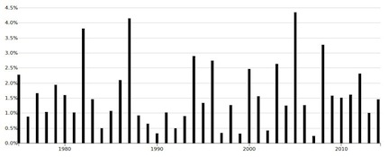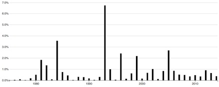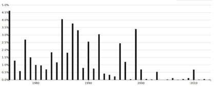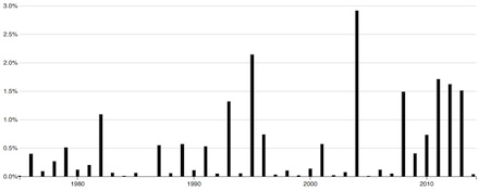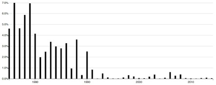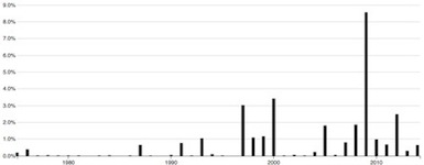 But that importance has varied over time. One of the most interesting features of the anniversary site is the chronological bar graphs located on the left-hand side of the list of topics. These graphs indicate the weight of the topic in each annual volume of Signs. So if we look at the bar graph for Historical Terms, we find that in the 1970s and 80s, history and the other words associated with this topic sometimes contributed 10 percent of the words in the volume for that year. After 1999, the weight of history falls to 2 or 3 percent annually. Whether this decline is significant or random is not indicated on the site, but it is certainly not the only change in the composition of the journal. A topic of quantitative terms (percent, table, number, rate, sample) was the subject of a significant number of articles in the 1970s and 1980s, but it disappears in the 1990s. The topic that includes the terms psychology and psychologists was important in the first years of the journal but vanishes in the 1990s. Other topics grew in importance: the topic grouping the words political, cultural, difference, discourse, discursive, Foucault barely existed in the years before 1985 but ballooned thereafter to contribute almost 10 percent of the words in each volume. Similarly, the topic labeled Globalization (world, global, international, transnational) only appeared around 1995 but now provides as much as 10 percent of the words in several issues.