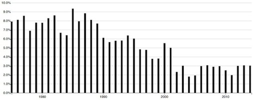 Some of the trends so graphically displayed in the topic model are far from surprising. Most observers would expect that women would be one of the most frequently discussed topics in any endeavor subtitled Journal of Women in Culture and Society. But when a temporal dimension spanning four decades is added, it is quite possible to conclude that the subtitle no longer anchors journal content in the same way that it did in the early years. Women in particular nations, movements, professions, ethnicities, and peoples constituted more than 5 percent of the content of the journal between 1975 and 2000, cresting at 9 percent in 1985. Yet women's proportion of the content has been declining of late, hovering below 3 percent since 2001. If one considers explicit comparisons of women and men, the disappearance of the genre seems all the more pronounced, falling from a high of 9 percent of the content in 1977 to 4 percent in 1990 and—with the exception of 2005, when explicit comparisons of men and women absorbed 3 percent of journal content—has hovered well below 1 percent over the past twenty-five years. Thus, a curious feminist following Cynthia Enloe's (1989) lead might well ask, where are the women, or what has become of women in the journal dedicated to the new scholarship on women?